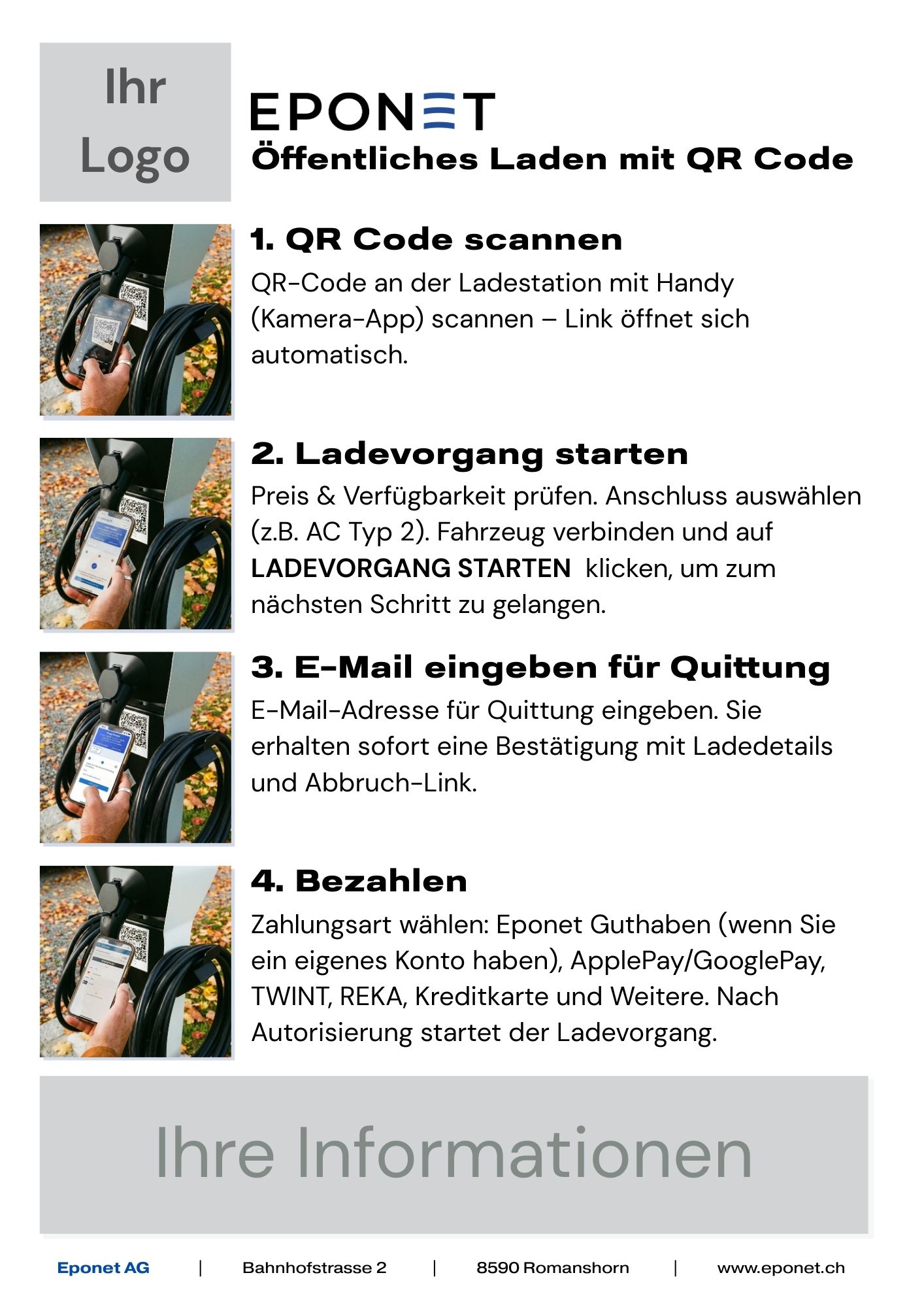 Möchten Sie Ihre Kunden mit einer personalisierten Ladeanleitung betreuen? Wir erstellen Ihnen diese Anleitung mit Ihrem Logo, Ihren Farben und spezifischen Informationen zu Ihrem Standort. Perfekt für eine professionelle Kundenbetreuung an Ihren Ladestationen.