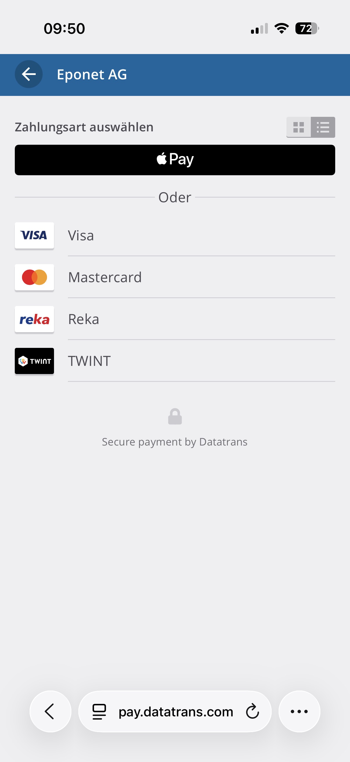 Im dritten und letzten Schritt ist der Bezahlvorgang. Sie haben die Auswahl zwischen Kreditkarte, Reka und TWINT und je nach Smartphone auf das im Smartphone hinterlegte Zahlungsmittel. Beim iPhone kommt Apple Pay und bei einem Android Handy kommt Google Pay.