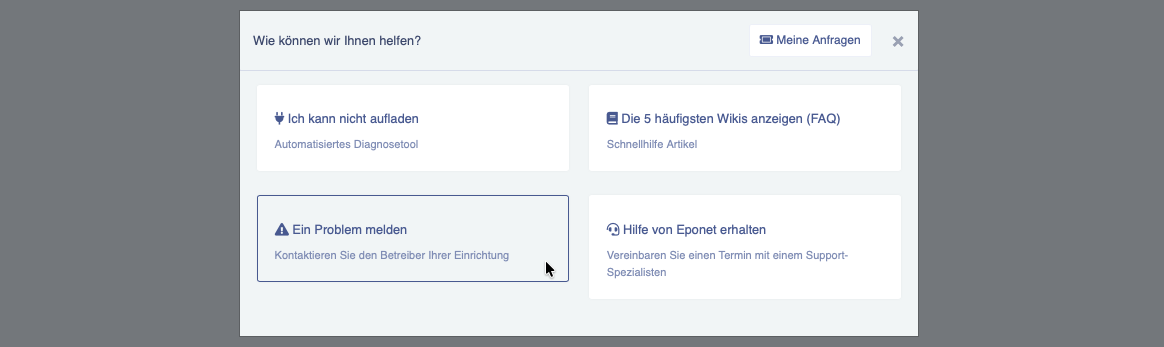 Gerne unterstützen wir Sie auch bei Themen, welche sich abseits Ihres konkreten Ladevorgangs bewegen. Nachfolgend finden Sie eine Reihe von Ressourcen zur Bearbeitung von Anliegen betreffend des Eponet-Portals oder der von Ihnen genutzten Ladestation.