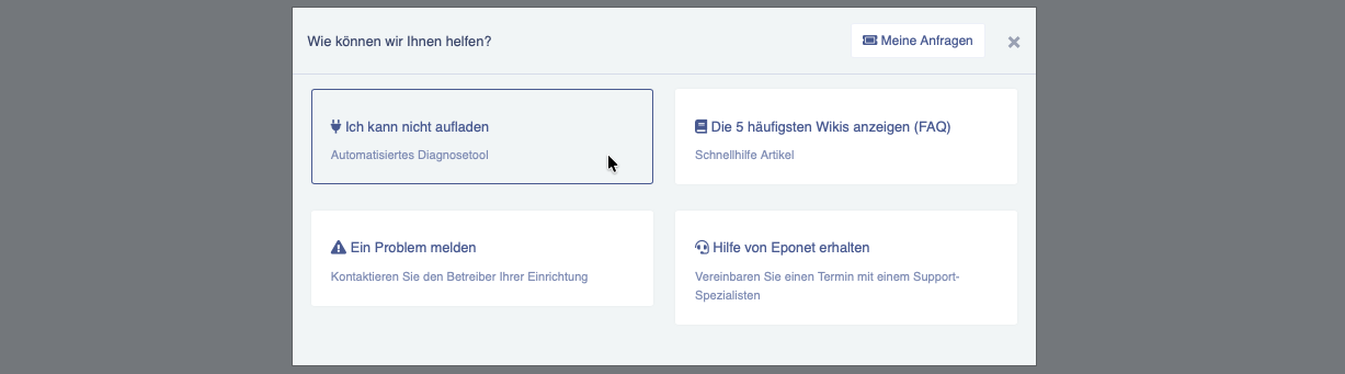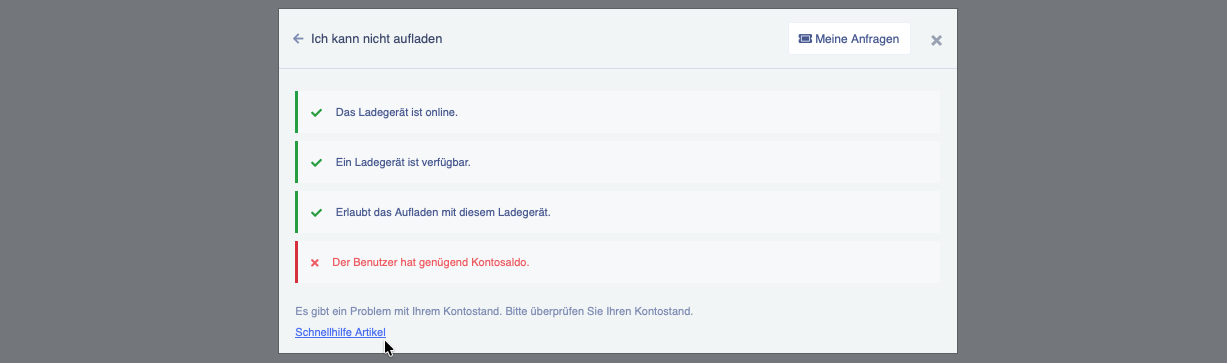 Das Diagnosetool erkennt automatisch, falls Sie Ihr Ladeproblem selbstständig beheben können. Entsprechend des Analyseresultats wird Ihnen automatisch ein Link zum passenden Schnellhilfe-Artikel in unserem Wiki zur Verfügung gestellt. Mit den darin enthaltenen Anleitungen können Sie das jeweilige Problem unkompliziert selbst beheben, um Ihren Ladebetrieb wiederzustellen.