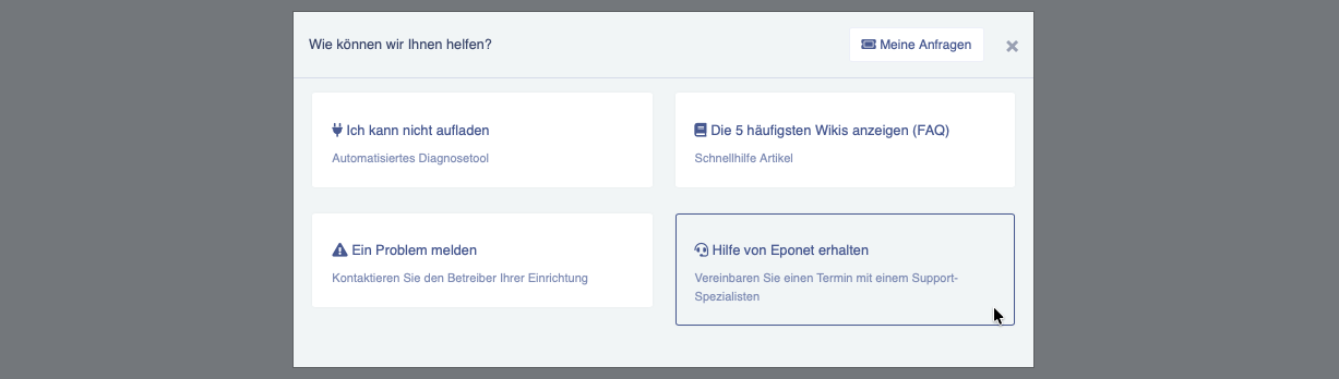 Hierzu wählen Sie im Support-Bereich die Option "Hilfe von Eponet erhalten".