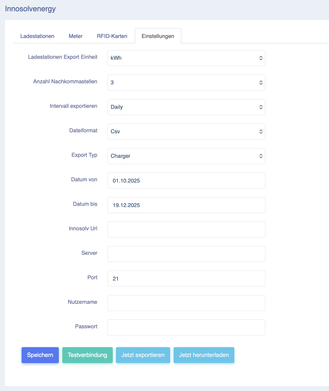 Sobald Ladegeräte, Meter und/oder RFID Karten erfasst wurden, können Sie den Export der Daten einrichten.