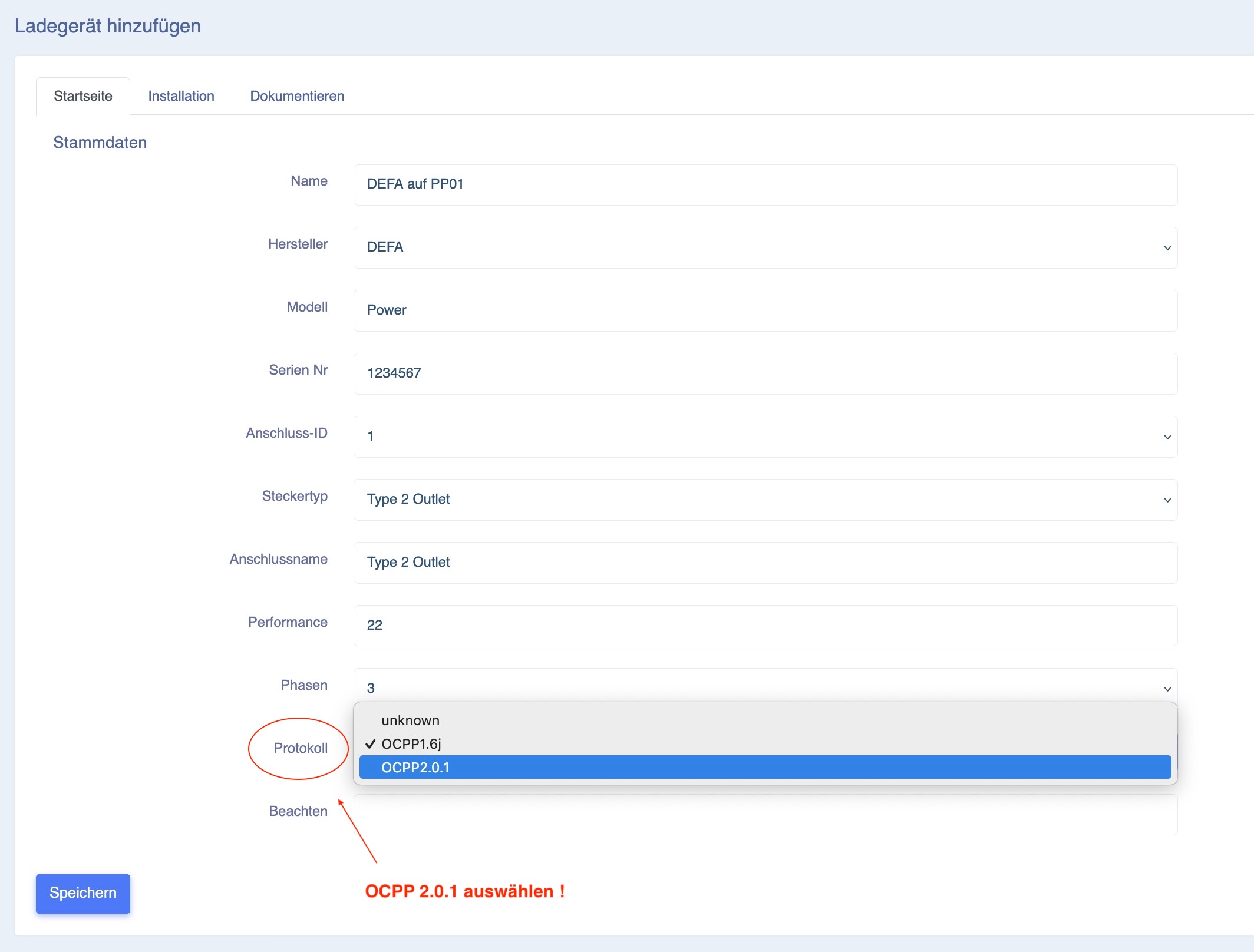 Die DEFA AC Ladestation kommuniziert ausschliesslich mit OCPP 2.0.1 - beim Aufschalten auf dem Eponet Portal muss dies zwingend ausgewählt werden!