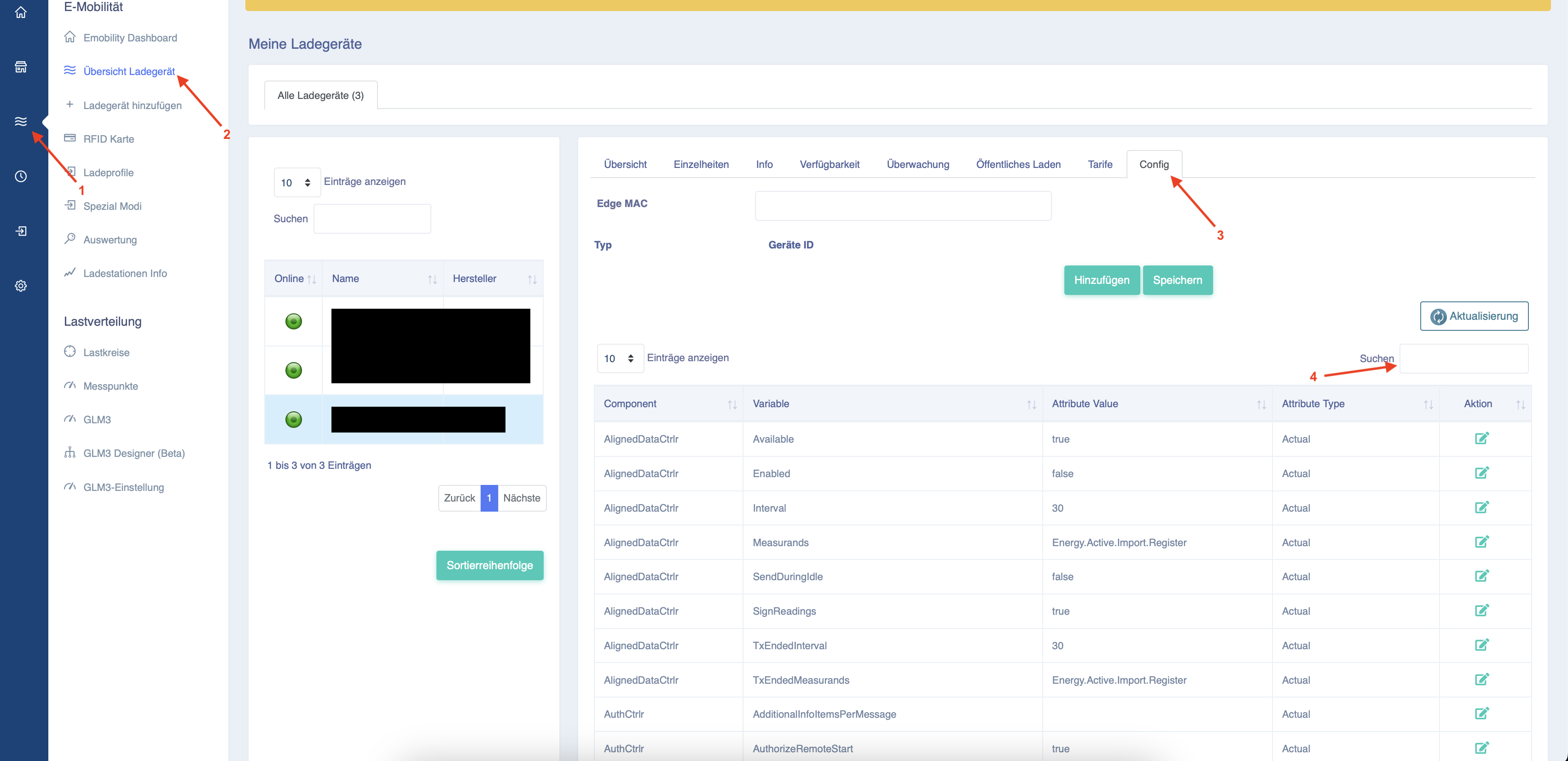 Folgen Sie den Pfeilen 1 und 2. Wählen Sie dann die entsprechende Ladestation aus und klicken Sie beim Pfeil 3.
