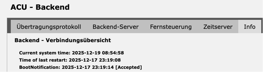 Speichern Sie im Anschluss die Einstellungen und starten Sie die Ladestation neu. Unter «Info» sehen Sie, ob die Ladestation erfolgreich eine Verbindung zum Eponet-Backend aufgebaut hat.