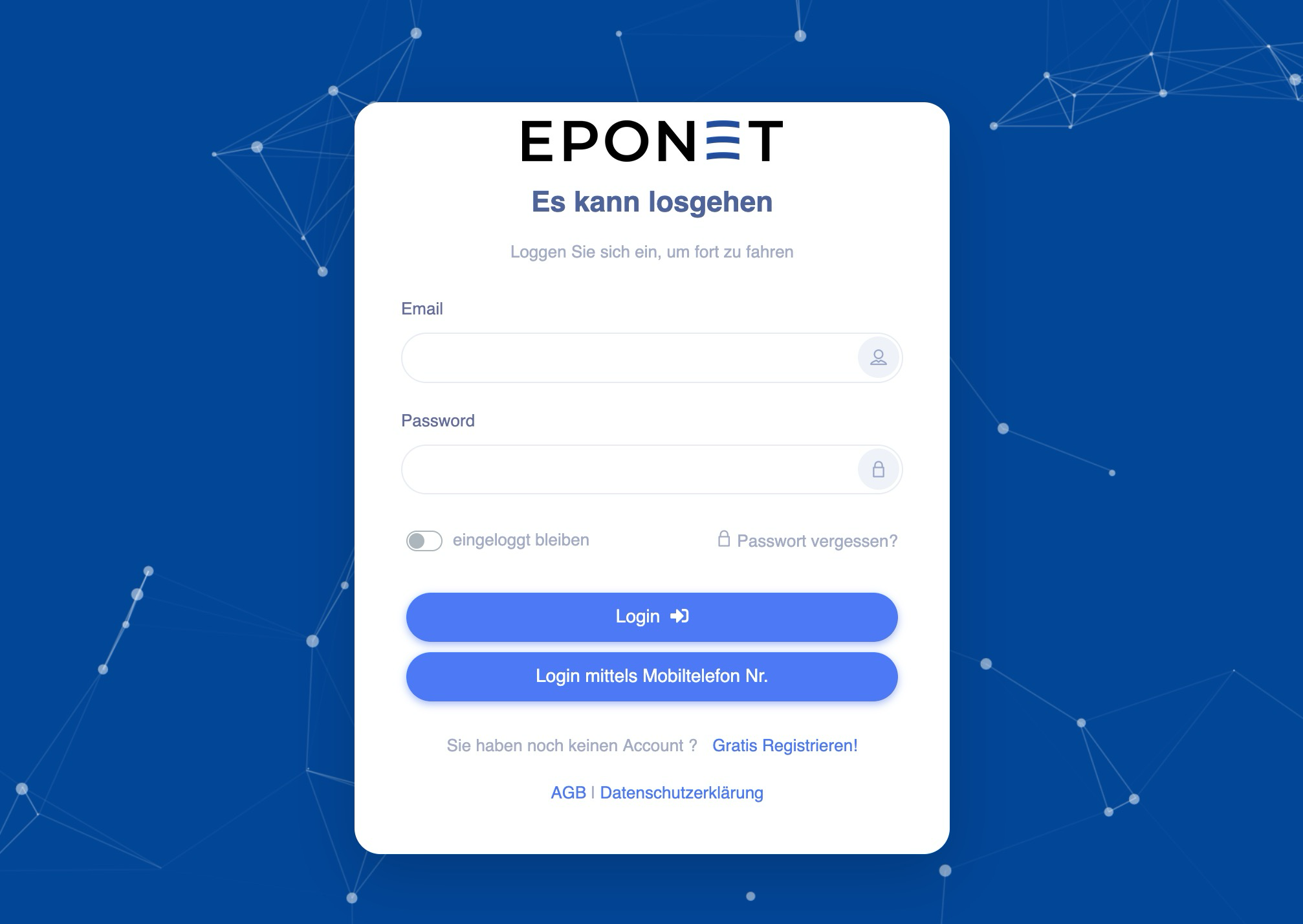 Die Startseite zu Ihrem Konto ist das Eponet Portal. Hier können Sie sich mit Ihrer E-Mail Adresse und Passwort einloggen. Da im Migrationsprozess Ihr Konto bereits erstellt worden ist, können Sie sich bei der Erstanmeldung mit Passwort vergessen ein neues Passwort per Mail zukommen lassen.